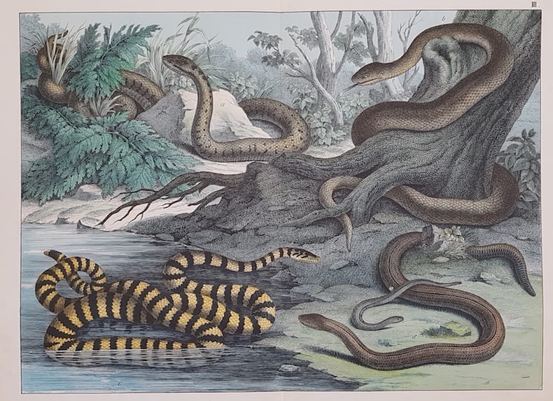 Deliziosa incisione del 1880 circa che mostra una scena naturale con sei specie di serpenti. Grandi dimensioni. Data: 1880 circa Tecnica: incisione a bulino Dimensione della pagina: 41,5x32,5 cm Dimensione dell'incisione: 26,5x36 c Condizioni: ottime. Qualche fioritura Coloured engraving refined by hand of 1880 circa representing a natural scene with six pecies of snakes. Big size. In good conditions, foxings. Vertical folding.<BR>TECHNIQUE: coloured steel engraving refined by hand LEAF SIZE: cm 32,5x41,5 PRINT'S SIZE: cm 26,5x36 PERIOD: 1880 circa CONDITION: very good conditions. Some foxings