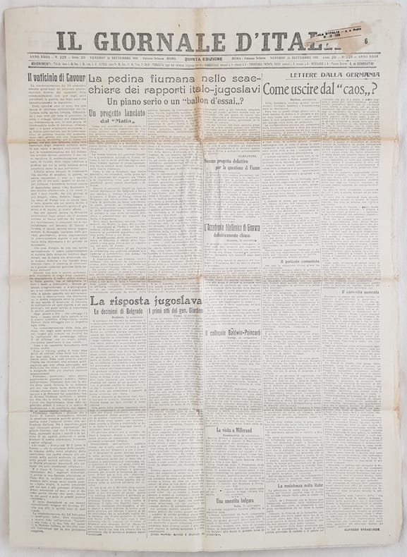 In folio. Dim. 58x43 cm. Pp. 6. Numero del 21 settembre 1923 di questo raro quotidiano fondato a Roma nel 1901 e chiuso nel 1973. All'interno: Cavour, La pedina fiumana nelle chiacchere dei rapporti italo jugoslavi, Accademia filellenica di Ginevra, La risposta jugoslava, Marche: Porto S. Elpidio, Pesaro, Macerata, Urbino, Pioraco, Ascoli Piceno, Fermo, concerto Ariani a Tolentino, giornate senesi, i britannici mettono ordine nella vasta casa imperiale, Dal campidoglio a Porta Pia, socialismo in Danimarca, Girardengo vince la XX settembre tragedia a Livorno pubblicità d'epoca.In buone condizioni. Raro. Brossura editoriale in buone condizioni generali con lievi usure ai margini e dorso. Piegature. . All'interno le pagine si presentano in buone condizioni con rare fioriture. Piegature. Strappi all'ultima pagina. Number of the 21st of september 1923 of this scarce daily newspaper established in Rome in 1901 and closed in 1973. Inside: Cavour, Fiume, Accademia filellenica di Ginevra, jugoslavia, Marche: Porto S. Elpidio, Pesaro, Macerata, Urbino, Pioraco, Ascoli Piceno, Fermo, concerto Ariani a Tolentino, giornate senesi, i britannici mettono ordine nella vasta casa imperiale, Dal campidoglio a Porta Pia, socialism in Denmark, Girardengo wins the XX settembre, tragedy in Livorno advertisings.<BR>In good conditions. Scarce copy Editorial cover in good general conditions slightly worn in the edges and spine. Foldings. Inside pages are in good conditions with occasional foxings. Foldings. Tears.