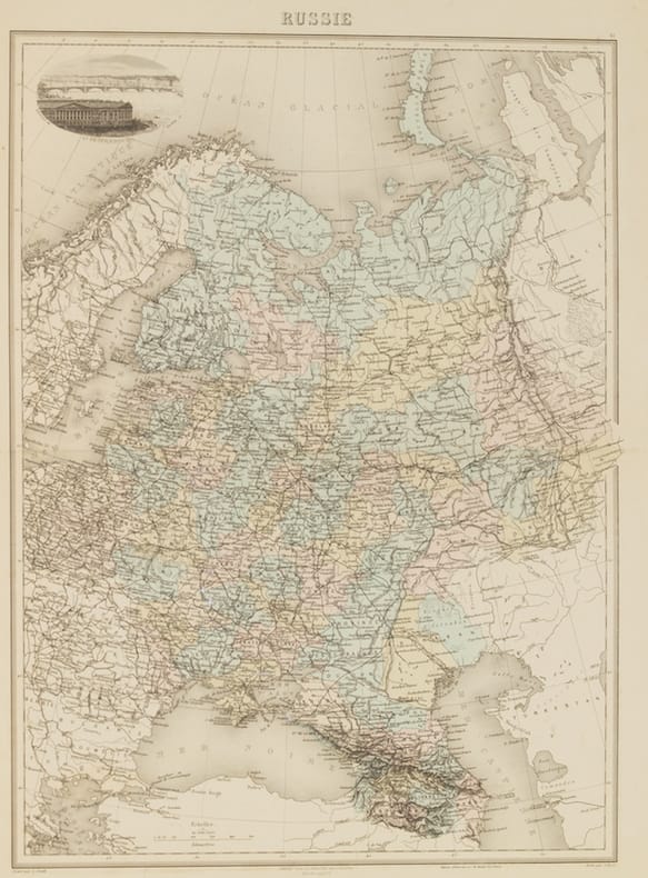 Bella mappa di grandi dimensioni della Russia del 1850 circa colorata a mano. Al margine superiore piccola veduta di San Pietroburgo Data: 1850 circa Autore: L. Smith su disegno di A. Biset Tecnica: incisione su rame Dimensione foglio: 52x38,5 cm Dimensione dell'incisione: 42x31 cm Condizioni: ottime. Qualche fioritura. Very beautiful map of big size of Russia of 1850 circa coloured by hand. Little view of Saint Petersburg in the upper edge Date: 1850 circa Author: L. Smith after A. Biset Technique: etching on copper Leaf Dimension: 52x38,5 cm Engraving Dimension: 42x31 cm Conditions: Very good conditions. Some foxings