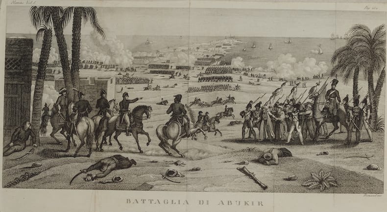 Bella scena della battaglia di Abukir della seconda campagna in Egitto di Napoleone. Autore: Romanil Atlante: De Norvins Storia di Napoleone Firenze, Pillori 1847-1850 Data: 1847 circa Tecnica: acquaforte su rame Dimensione della pagina: 24x45,5 cm Dimensione dell'incisione: 20,5x42 cm Condizioni: ottime. Qualche fioritura. Piegatura verticale Beautiful view of the Battle of Abukir of the second Egypt Campaign of Napoleon Author: Romanil Atlas: De Norvins Storia di Napoleone Firenze, Pillori 1847-1850 Date: 1847 circa Technique: etching on copper Leaf Dimension: 24x45,5 cm (9.4x17.9 inches) Engraving Dimension: 20,5x42 cm (8.1x16.5 inches) Conditions: Good conditions. Vertical folding.