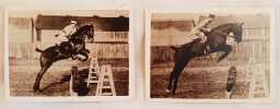 Deliziosa raccolta di tre fotografie in sequenza degli anni '30 che mostra un fantino sopra un cavallo nell'atto di saltare un ostacolo. Al verso nota manoscritto 11, 12, 13. In ottime condizioni. cm. 7x9,5 Nice colection of three consequent photoes of 1930 showing an horse while jumping an obstacle. In the verso handwritten note 11, 12, 13. In very good conditions. cm. 7x9,5