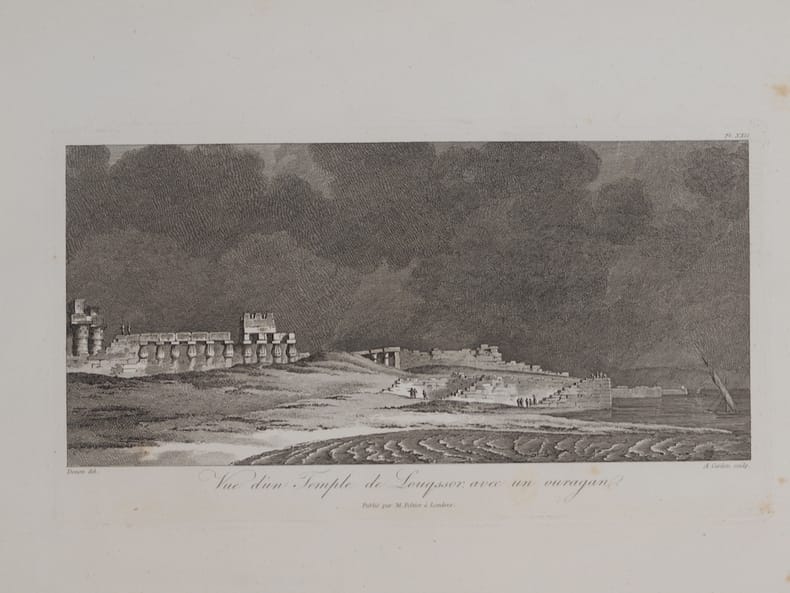 Splendida veduta animata di un Tempio di Luxor in Egitto durante una tempesta. Autore: Antoine Alexandre Joseph Cardon (1739-1822) su disegno di Denon Atlante: Dominique Vivant Denont - Voyage dans la basse et la haute Egypte pendant les campagnes du General Bonaparte, London, M. Peltier Data: 1807 circa Tecnica: acquaforte su rame Dimensione della pagina: 29,5x47,5 cm Dimensione dell'incisione: 16x28,5 cm Condizioni: ottime. Qualche fiorituraWonderful animated view of a Temple of Luxor in Egypt during a storm. Author: Antoine Alexandre Joseph Cardon (1739-1822) after Denon Atlas: Dominique Vivant Denont - Voyage dans la basse et la haute Egypte pendant les campagnes du General Bonaparte, London, M. Peltier Date: 1807 circa Technique: etching on copper Leaf Dimension: 29,5x47,5 cm (11.6x18.7 inches) Engraving Dimension: 16x28,5 cm (6.3x11.2 inches) Conditions: Very good conditions.