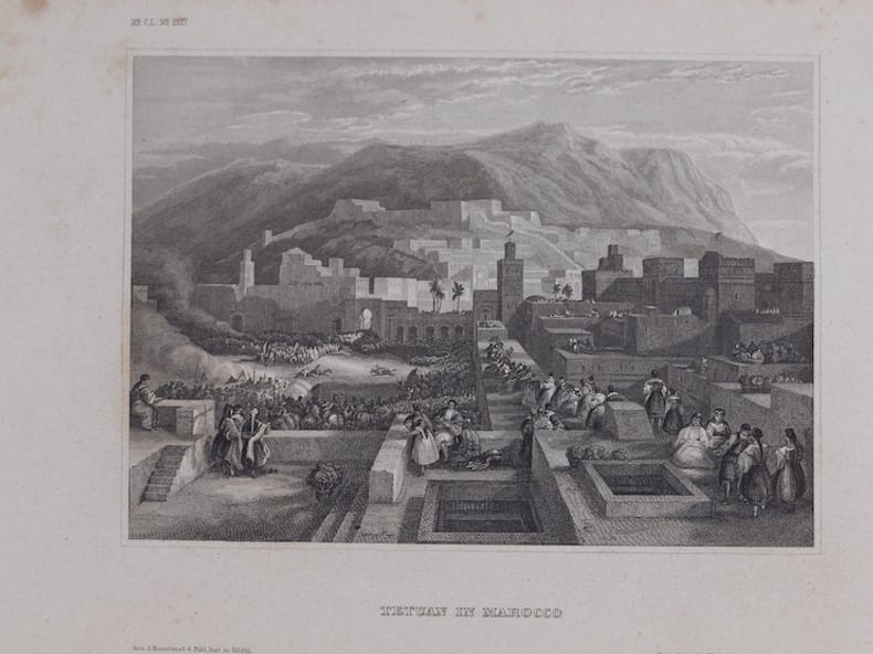 Bella veduta animata di Tetuan in Marocco del 1840 circa. Atlante: Meyer s Universum 1838-1860 circa Data: 1840 circa Tecnica: Incisione su acciaio Dimensioni Foglio: 17,5x25 cm Dimensione Incisione: 10,5x14,5 cm Condizioni: Buone. Qualche fioritura. Usure al margine destroBeautiful animated view of Tetuan in Marocco of 1840 circa. Date: 1840 circa Atlas: Meyer s Universum 1838-1860 circa Technique: Steel etching Leaf Dimension: 17,5x25 cm (6.9x9.8 inches) Engraving Dimension: 10,5x14,5 cm (4.1x5.7 inches) Conditions: Good conditions. Some foxings and worn edge
