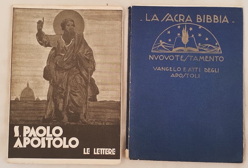 In 8. Dim. 24,5x18,5 cm. Pp. 172+(4), 228+(2). Edizione Cantagalli degli anni '20 del Nuovo Testamento.<BR>Siamo in possesso delle lettere di San Paolo Apostolo. Traduzione da Mons. Adriano Pierazzuoli. Il secondo volume contiene il Vangelo e gli Atti degli apostoli. Alcune planches all'interno. In buone condizioni. Copertina editoriale in buone condizioni generali con lievi usure ai margini e dorso. Legatura in buone condizioni. All'interno le pagine si presentano in buone condizioni con fioriture. Cantagalli edition of 1920's of New Testament. We only have the letters of San Paolo Apostolo. Translation by Mons. Adriano Pierazzuoli. The second volume contains the Gospel and acts of apostles. Some planches inside. In good conditions Editorial cover in good general conditions slightly worn in the edges and spine. Binding in good conditions. Inside pages are in good conditions with foxings.