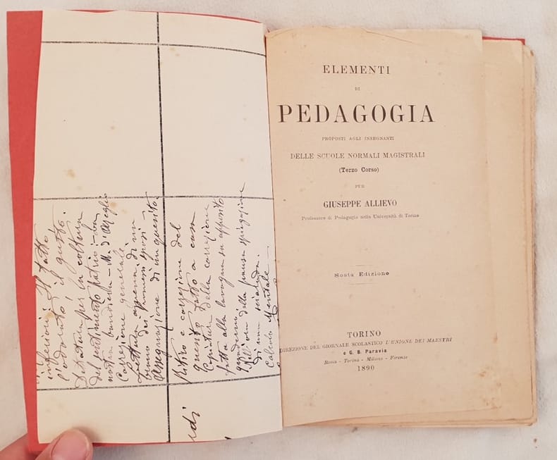 In 8. Dim. 19x13 cm. Pp. 96 Edizione del 1890 di questo manuale di pedagogia scritto da Giuseppe Allievo. All'interno: educazione dell'uomo, pedagogia, la vita dell'uomo e della donna, scopo metodo forme dell'educazione, educazione preso gli antichi popoli occidentali, orientali, La Giudea, Medioevo rinascenza e tempi moderni ecc Note manoscritte al piatto anteriore posticcio.In discrete condizioni. Copertina morbida posticcia in discrete condizioni generali con lievi usure ai margini e dorso. Piatto anteriore staccato e posteriore attaccato al piatto posteriore. Legatura in discrete condizioni. All'interno le pagine si presentano in buone condizioni con fioriture. Edition of 1890 of this manual of pedagogy written by Giuseppe Allievo. In fair conditions. Soft false cover in fair general conditions slightly worn in the edges and spine. Front plate is detached and back plate attached to back plate. Binding in fair conditions. Inside pages are in good conditions with foxings.