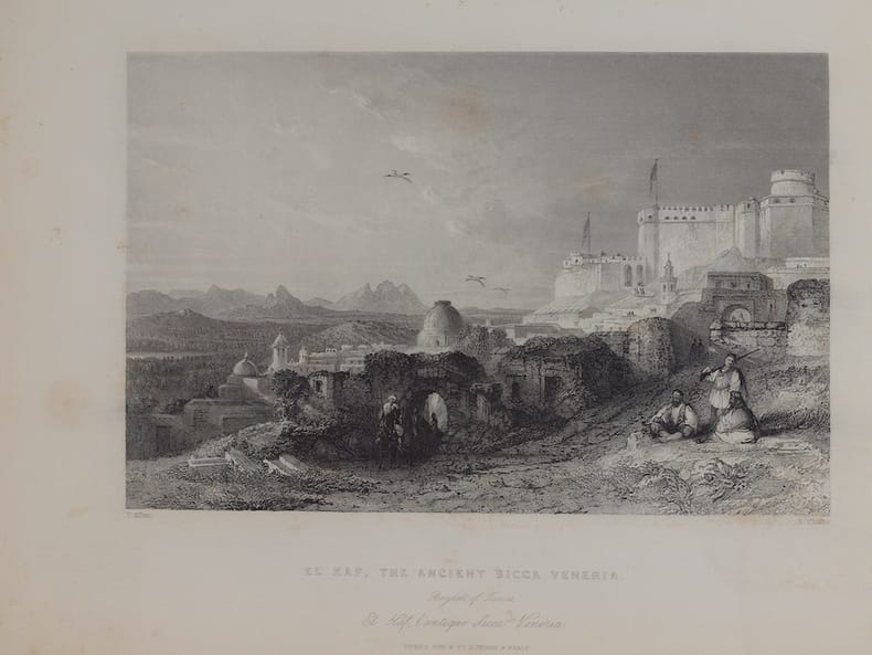 Bella veduta animata di El Kef in Tunisia del 1845 circa. Autore: E. Challis su disegno di Thomas Allom Data: 1845 circa Tecnica: Incisione su acciaio Dimensioni Foglio: 21x27 cm Dimensione Incisione: 12x18,5 cm Condizioni: Buone. Qualche fioritura. Usure al margine destro. Beautiful animated view of the the city of El Kef in Tunisia of 1845 circa. Author: E. Challis after Thomas Allom Date: 1845 circa Technique: Steel etching Leaf Dimension: 21x27 cm Engraving Dimension: 12x18,5 cm Conditions: Good conditions. Some foxings and worn edge