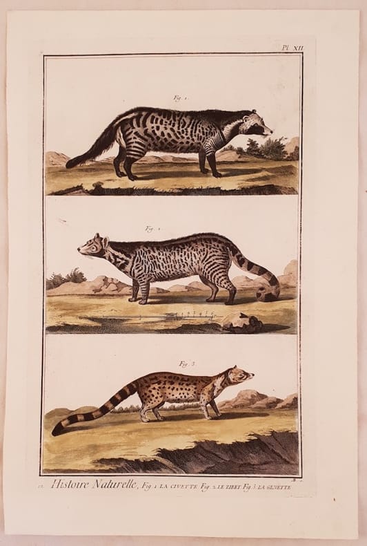 Deliziosa incisione colorata ad acquarello del 1770 circa che mostra lo zibetto e una genetta. Grandi dimensioni. Autore: Antonio Baratti (1724-1787) Atlante: Diderot et dAlembert Encyclopedie Livorno, 1770-1778 Data: 1770 circa Tecnica: incisione a bulino acquarellata a mano Dimensione della pagina: 40,5x27,5 cm Dimensione dell'incisione: 35,5x22,5 cm Condizioni: ottime. Qualche fioritura Segno di tarlo al margine inferiore. Nice print of 1770s featuring one zibet, a genet coloured with aquarello by hand. Big size. Author: Antonio Baratti (1724-1787) Atlas: Diderot et dAlembert Encyclopedie Livorno, 1770-1778 Date: 1770 circa Technique: buri engraving Leaf Dimension: 40,5x27,5 cm Engraving Dimension: 35,5x22,5 c Conditions: Very good conditions.