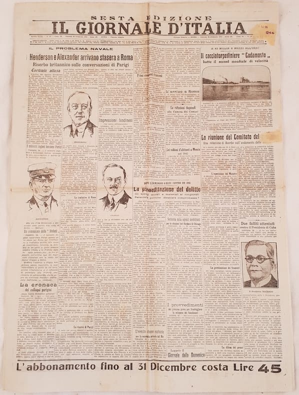 Numero del 26 febbraio 1931 di questo raro quotidiano fondato a Roma nel 1901 e chiuso nel 1973.<BR>All'interno: Henderson e Alexander arrivano stasera a Roma, il cacciatorpediniere Cadamosto, Relaizone di Acerbo, Dopo il criminoso gesto contro Re Zog, Due falliti attentati contro il Presidente di Cuba Machado, La nostra situazione coloniale, Commissione per la carta della mezzadria, Commemorazione del Beato Angelico, Urbino la citta dei Duchi, Assemblea della Croce Verde di Fabriano, La tragica ascensione sulle Alpi Trentine, pubblicità d'epoca. In buone condizioni. Raro. Brossura editoriale in buone condizioni generali con lievi usure ai margini e dorso. Piegature. All'interno le pagine si presentano in buone condizioni con rare fioriture. Piegature. Foro alla prima pagina con perdita di testo. In folio. Dim. 58,5x42 cm. Pp. 8. Number of the 7th of september 1923 of this scarce daily newspaper established in Rome in 1901 and closed in 1973.<BR>Inside: Henderson and Alexander together in Rome, Cadamosto, Report of Acerbo, after gesture of King Zog, two failed attacks against President of Cuba Machado, Our colonial situation, Commemoration of the Blessed Angelico, Urbino, Assembly of Green cross in Fabriano, Tragic ascnesion of Trentino Alps Alpi Trentine, advertisings. In good conditions.Editorial cover in good general conditions slightly worn in the edges and spine. Foldings. Inside pages are in good conditions with occasional foxings. Foldings. Missing parts in the foldings. In folio. Dim. 58,5x42 cm. Pp. 8.