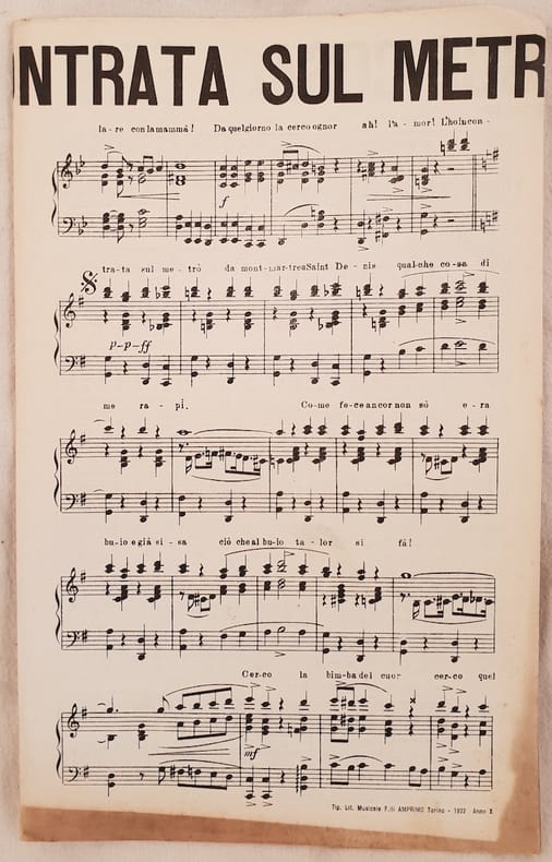 Bello spartito, partitura completa per orchestra del 1932 di due canzoni di Domenico Oneglio.<BR>Copertina mancante. GENERE: Fox caratteristico e one step<BR>STRUMENTI: pianoforte, violino, cello, flauto, batteria, trombe, trombone <BR>ANNO: 1932 DIMENSIONI: In 8. cm 27,5x17,5 PAGINE: 34 CONDIZIONI: In buone condizioni NOTE: Ex libris alla prima pagina Beautiful score of two songs, a complete score for orchestra of 1932 of two songs of Domenico Oneglio. <BR>Cover is missing MUSIC: Fox caratteristico e one step STRUMENTI: piano; violin; cello; flute, drums, trumpet, trombone YEAR: 1932 SIZE: In 8. cm 27,5x17,5 PAGES: 34 CONDITIONS: In good conditions NOTES: Ex libris in the page