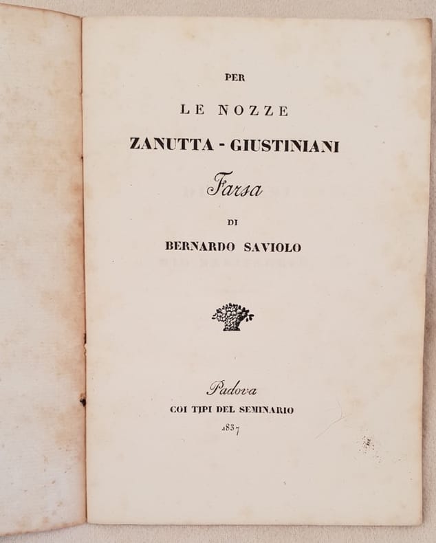 Interessante pubblicazione del 1838, una farsa teatrale scritta in occasione del matrimonio Zanutta Giustiniani da Bernardo Saviolo. In buone condizioni e completo. Copertina morbida coeva con numero stampato in buone condizioni generali con lievi usure ai margini e dorso. Legatura in buone condizioni. All'interno le pagine si presentano in ottime condizioni con rare fioriture. In 16. Dim. 16x11 cm. Pp. 32. Interesting pamphlet of 1838, a theatre written in occasion of the marriage Zanutta Giustiniani by Bernardo Saviolo. In good conditions and complete. Soft cover with published number in good general conditions slightly worn in the edges and spine. Binding in good conditions. Pages in very good conditions with occasional foxings. In 16. Dim. 16x11 cm. Pp. 32
