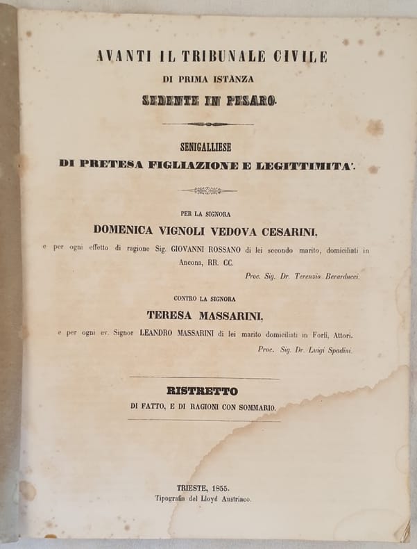 In 4. Dim. 29x22,5 cm. Pp. 40. Interessante pubblicazione di diritto del 1855 che riporta la causa in tribunale tra Domenica Vignoli vedova Cesarini e Teresa Massarini. La causa è incentrata sulla pretesa legittimità di Teresa Massarini di essere figlia di Francesca Marlini Arsilli e Pio Cesarini. In buone condizioni. Antica firma in copertina. Copertina mrbida coeva in buone condizioni generali con lievi usure ai margini e dorso. Legatura in buone condizioni. All'interno le pagine si presentano in buone condizioni con fioriture. Piegatura verticale. Interesting pamphlet of law of 1855 about the trial between Domenica Vignoli widow Cesarini and Teresa Massarini. In the trial Teresa Massarini declaired to be daughter of Francesca Marlini Arsilli and Pio Cesarini. In good conditions. Ancient signature in the cover. Soft coeval cover in good general conditions slightly worn in the edges and spine. Binding in good conditions. Inside pages are in good conditions with foxings. Vertical folding.