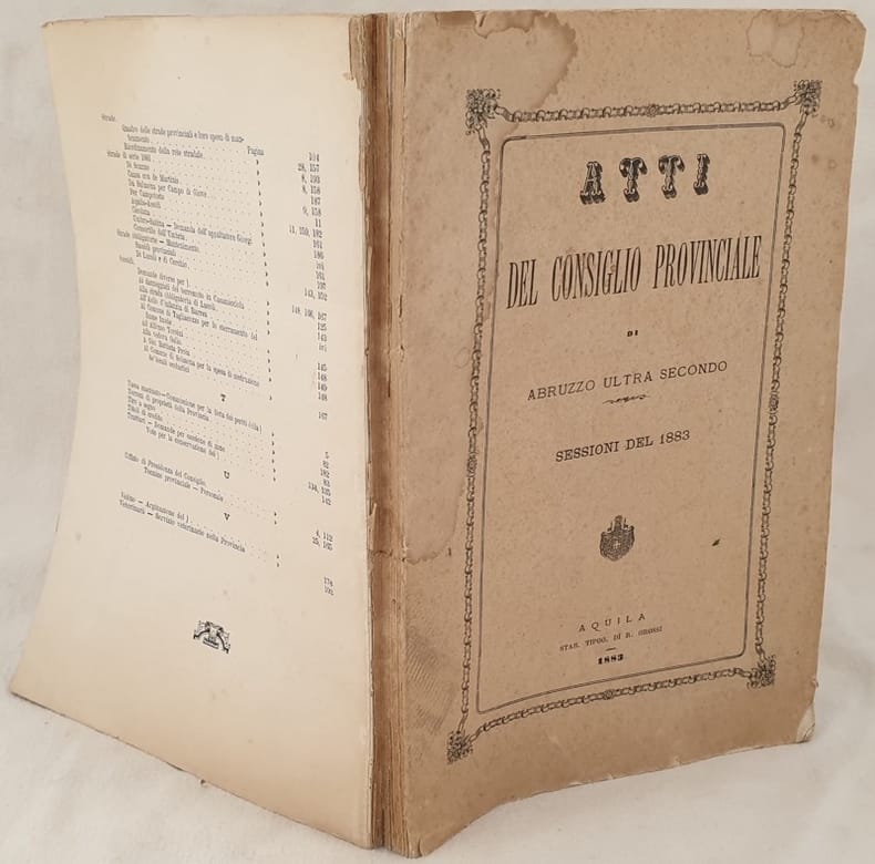Raccolta di atti del 1883 del Consiglio Provinciale di Abruzzo Ultra 2° (distretti dell'Aquila, Cittaducale, Sulmona, Avezzano). All'interno: Elenco nominativo dei consiglieri provinciali, Servizio postale Avezzano Arsoli Tivoli, Convitto nazionale di Aquila, Reali Carabinieri, Stato presente della Biblioteca, oggetto degli stanziamenti, Ospizio provinciale di mendicità contabilita speciale bilancio per l'esercizio 1884, Ferrovia Solmona Isernia Campobasso, Comune di Tagliacozzo, Lista con nomi dei votanti dei vari distretti, Progetto pel riordinamento della rete stradale in provincia di Aquila, quadro generale di viabilita, Calcolo degli stanziamenti annuali per la costruzione delle nuove strade di serie ecc... In discrete condizioni. Copertina editoriale in discrete condizioni generali con usure ai margini e dorso. Piatto posteriore assente. Legatura in buone condizioni. All'interno le pagine si presentano in buone condizioni con fioriture. Gora d'umidità al piatto anteriore. In 4. Dim. 28,5x19,5 cm. Pp. 201+(1)+71+(5). Collection of acts of 1883 of Consiglio Provinciale di Abruzzo Ultra 2° (districts of Aquila, Cittaducale, Sulmona, Avezzano). Postal serviceServizio postale Avezzano Arsoli Tivoli, Convitto nazionale di Aquila, Reali Carabinieri, Condition of library, Ospizio provinciale di mendicità contabilita speciale bilancio per l'esercizio 1884, Railway Solmona Isernia Campobasso, Comune di Tagliacozzo, List with name of voters for districts, Reordination of streets of Aquila, general frame of streets etc... In fair conditions. Editorial cover in fair general conditions slightly worn in the edges and spine.Back plate is missing. Binding in good conditions. Inside pages are in good conditions with foxings. Water stain in the front plate. In 4. Dim. 28,5x19,5 cm. Pp. 201+(1)+71+(5).