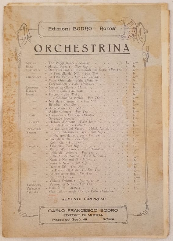 Bello spartito, partitura completa per orchestra degli anni '30 di una canzone di Italo Nucci.<BR>Copertina editoriale originale.<BR>GENERE: Tango STRUMENTI: pianoforte, violino, violoncello, contrabasso, flauto <BR>ANNO: anni '30 DIMENSIONI: In 8. cm 25,5x17 PAGINE: 7 CONDIZIONI: In buone condizioni NOTE: Ex libris alla prima pagina Beautiful score of one song by Italo Nucci, a complete score for orchestra of 1930's. Editorial original cover. MUSIC: Tango STRUMENTI: piano; violin; violoncello; contrabbass; flute YEAR: 1930's SIZE: In 8. cm 25,5x17 PAGES: pp. 7 CONDITIONS: In good conditions NOTES: ex libris in the first page