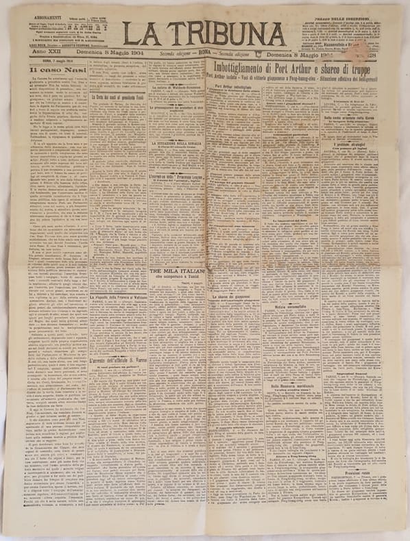 Numero del 8 maggio 1904 del quotidiano "La Tribuna" fondato a Roma nel 1883 dai politici Alfredo Baccarini e Giuseppe Zanardelli. Venne pubblicato fino al Novembre 1946.<BR>All'interno: Il caso Nasi, Imbottigliamento di Port Arthur e sbarco di truppe, L'arresto dell'ufficiale San Varese, Tremila italiani che scioperano a Tunisi, Orribile infortunio a Casal Monferrato, Dopo l'elezione di Forli, Onorevole Nasi ecc.. In buone condizioni. Raro. Brossura editoriale in buone condizioni generali con lievi usure ai margini e dorso. Piegature. (vedere foto). Legatura assente. All'interno le pagine si presentano in buone condizioni con rare fioriture. In folio. Dim. 60x45 cm. Pp. 6. Number of the 8th of may 1904 of the daily magazine "La Tribuna" established in Rome in 1883 by the politicians Alfredo Baccarini and Giuseppe Zanardelli. It was published until the november 1946.<BR>Inside: Nasi, Bottle of Port Arthur, Arrest of officier San Varese, Three thousand italians who strike in Tunisi, Casal Monferrato, After election in Forli, Onorevole Nasi.<BR>In good conditions. Editorial cover in good general conditions slightly worn in the edges and spine. Foldings. Binding is missing. Inside pages are in good conditions with occasional foxings. In folio. Dim. 60x45 cm. Pp. 6.