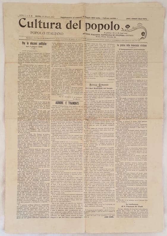 Numero del 25 maggio 1900 del quotidiano "Cultura del popolo".<BR>All'interno: Per le elezioni politiche del 3 giugno 1900, La pratica della democrazia cristiana, La festa della Democrazia Cristiana, A Firenze le conferenza del Prof. Toniolo, Calabria, Molise, Le due bandiere (dialogo) ecc.. In buone condizioni. Raro. Brossura editoriale in buone condizioni generali con lievi usure ai margini e dorso. Piegature. (vedere foto). Legatura assente. All'interno le pagine si presentano in buone condizioni con rare fioriture. In folio. Dim. 51x36 cm. Pp. 4. Number of the 25th of may 1900 of the daily magazine "Cultura del popolo".<BR>Inside: for political election of the 3rd of june 1900, The practice of democrazia cristiana, The feast of Democrazia Cristiana, In florence the Conference of Prof. Toniolo, Calabria, Molise, Le due bandiere (dialogo). In good conditions. Editorial cover in good general conditions slightly worn in the edges and spine. Foldings. Binding is missing. Inside pages are in good conditions with occasional foxings. In folio. Dim. 51x36 cm. Pp. 4.