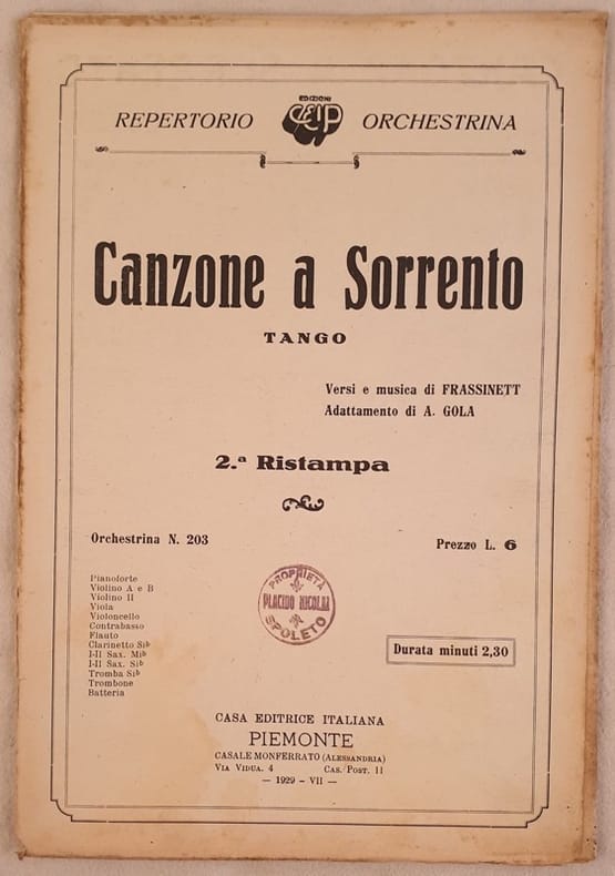 Bello spartito, partitura completa per orchestra del 1929.<BR>Caratteristica copertina decorata dell'epoca. GENERE: Tango STRUMENTI: pianoforte; violino; violoncello; viola; contrabasso; trombone; batteria; sassofono; flauto; tromba; clarinetto ANNO: 1928 DIMENSIONI: cm 27x18 PAGINE: 17 CONDIZIONI: Buone, fioriture, bruniture dorso usurato<BR>NOTE: Ex libris sulla copertina Beautiful score, a complete score for orchestra of 1929.<BR>Carachteristic decorated cover of that period. MUSIC: Tango STRUMENTI:piano; violin; violoncello; viola; contrabbass; trombone; drums; saxophone; flute; trumpet; clarinet YEAR: 1928 SIZE: cm 27x18 PAGES: 17 CONDITIONS: Good, foxings, yellowings, worn spine<BR>NOTES: Ex libris in the cover