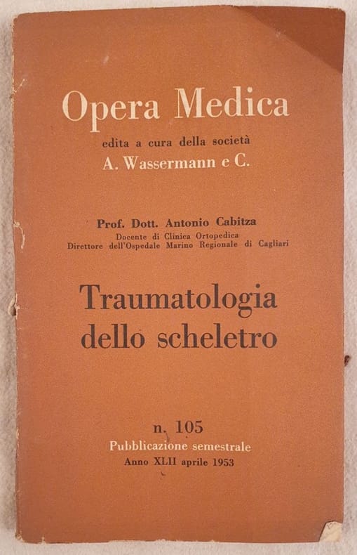Edizione del 1953 della serie "Opera Medica A. Wassermann e C."n. 105 di questo volume sulla traumatologia dellos cheletro scritto da Antonio Cabitza. Tra gli argomenti trattati: Distorsioni, trasporto dell'infortunato, terapia delle fratture, fratture esposte, contusionie ferite articolari, contenzione delle fatture, anestesia in traumatologia, cure coadiuvanti nel trattamento delle fatture cure, esiti e recupero ecc... In buone condizioni. Copertina editoriale in discrete condizioni generali con usure e strappi ai margini e dorso. Legatura in buone condizioni. All'interno le pagine si presentano in buone condizioni con rare fioriture e qualche piegatura agli angoli. In 16. Dim. 18x11 cm. Pp. 239+(1). Edition of 1953 of the series "Opera Medica A. Wassermann e C."n. 106 of this volume about tramautlogy of skeleton written by Antonio Cabitza.<BR>In good conditions. Editorial cover in fair general conditions with wearings and tears in the edges and spine. Binding in good conditions. Inside pages are in good conditions with occasional foxings and some foldings in the corners. In 16. Dim. 18x11 cm. Pp. 239+(1). <BR><BR>