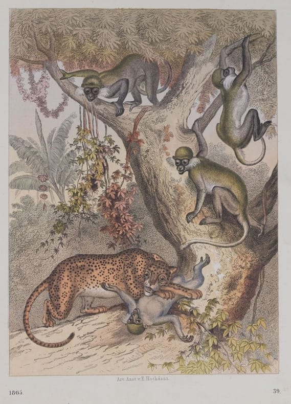 Bella incisione colorata a mano del 1865 che mostra una scena di caccia nella savana tra un leopardo e delle scimmie. Planche estratta da libro. TECNICA: Incisione su acciaio colorata<BR>DIMENSIONI FOGLIO: cm 27x19,5 DIMENSIONI INCISIONE: cm 21x15,5 EPOCA: 1865 In buone condizioni, qualche fioritura Coloured engraving of 1865 representing an hunting scene of a leopard with monkey.In good conditions, foxings. TECHNIQUE: coloured steel engraving LEAF SIZE: cm 27x19,5 PRINT'S SIZE: cm 21x15,5 PERIOD: 1865