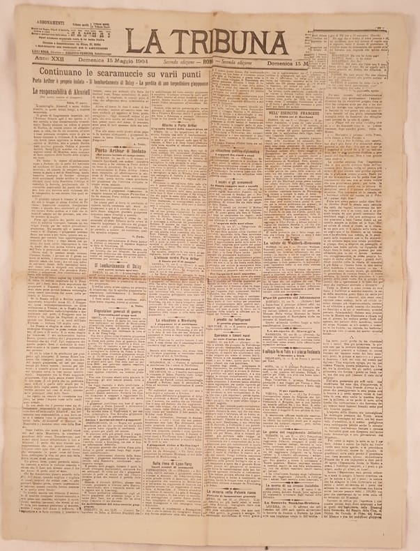 Numero del 15 maggio 1904 del quotidiano "La Tribuna" fondato a Roma nel 1883 dai politici Alfredo Baccarini e Giuseppe Zanardelli. Venne pubblicato fino al Novembre 1946.<BR>All'interno: Porto Arthur è isolato, La salute di Waldeck Rousseau, Nell'esercito francese le dimissioni di Marchand, Il bombardamento di Dainy, I disordini di Cavallino, L'istruttoria contro Nunzio Nasi e compagni ecc.. In buone condizioni. Raro. Brossura editoriale in buone condizioni generali con lievi usure ai margini e dorso. Piegature. Legatura assente. All'interno le pagine si presentano in buone condizioni con rare fioriture. Parte mancante alla prima pagina con perdita di testo. In folio. Dim. 60,5x45 cm. Pp. 6. Number of the 15th of may 1904 of the daily magazine "La Tribuna" established in Rome in 1883 by the politicians Alfredo Baccarini and Giuseppe Zanardelli. It was published until the november 1946.<BR>Inside: Porto Arthur is isolated, The health of Waldeck Rousseau, In french army the retirement of Marchand, The bombing of Dainy, the disorders of Cavallino, against Nunzio Nasi and partners.<BR>In good conditions. Editorial cover in good general conditions slightly worn in the edges and spine. Foldings. Binding is missing. Inside pages are in good conditions with occasional foxings. Missing part in the first page with loss of text. In folio. Dim. 60,5x45 cm. Pp. 6.