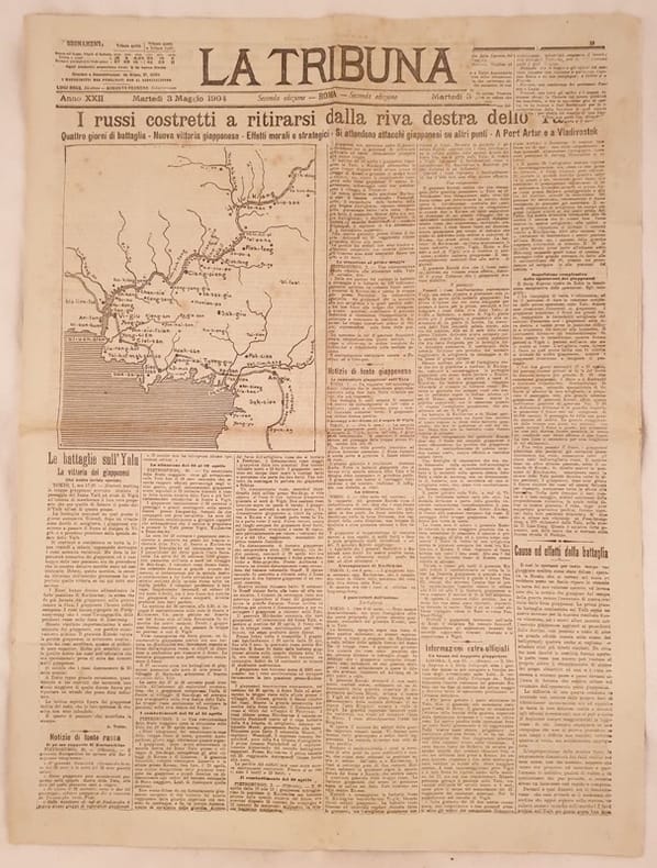 Numero del 3 maggio 1904 del quotidiano "La Tribuna" fondato a Roma nel 1883 dai politici Alfredo Baccarini e Giuseppe Zanardelli. Venne pubblicato fino al Novembre 1946.<BR>All'interno: I russi costretti a ritirarsi dalla riva destra, le battaglie sull'Yalu, L'esposizione universale di Saint Louis, Come passo il primo maggio in Italia, la mostra regionale romagnola, Il ritorno di Loubet a Parigi, La presa di Illig ecc.. In buone condizioni. Raro. Brossura editoriale in buone condizioni generali con lievi usure ai margini e dorso. Piegature. Legatura assente. All'interno le pagine si presentano in buone condizioni con rare fioriture. Parte mancante alla prima pagina con perdita di testo. In folio. Dim. 60,5x45 cm. Pp. 6. Number of the 3rd of may 1904 of the daily magazine "La Tribuna" established in Rome in 1883 by the politicians Alfredo Baccarini and Giuseppe Zanardelli. It was published until the november 1946.<BR>Inside: Russian forced to escape in right river, the battles of Yalu, Universal exposition of Saint Louis, the 1st of may in Italy, regional exibition in Romagna, Loubet in Paris, Illig. In good conditions. Editorial cover in good general conditions slightly worn in the edges and spine. Foldings. Binding is missing. Inside pages are in good conditions with occasional foxings. Missing part in the first page with loss of text. In folio. Dim. 60,5x45 cm. Pp. 6.
