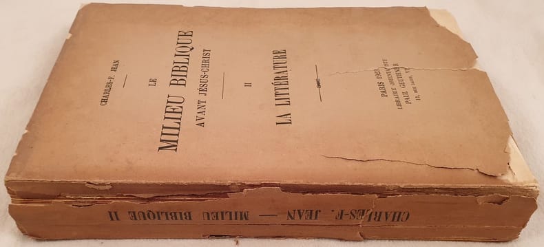 Edizione del 1923 di questa opera di argomento biblico scritto da Charles Jean. L'opera era composta da tre tomi, siamo purtroppo in possesso solo del secondo tomo. In quest'opera l'autore analizza la letteratura prima di Gesu Cristo. All'interno: Bassa Mesopotamia, Egitto, Caan, Ittiti, Babilonia, Assiro babilonesi, letetratura moabita, fenicia, Grecia, Letteratura extra biblica dei giudei ecc... In buone condizioni. Copertina editoriale in mediocri condizioni generali con usure e parti mancanti ai margini e dorso. Legatura in mediocri condizioni con rotture. All'interno le pagine si presentano in ottime condizioni con rare fioriture. In 8. Dim. 25x17 cm. Pp. XXIX+(1)+617+(1). Edition of 1923 of this work of bible issue written by Charles Jean. The work was made up of three tomes, unfortunately we only have the second tome. In this work the author analyzes litterature before Jesus Christ. In good conditions. Editorial cover in poor general conditions with wearings and missing parts in the edges and spine. Binding in poor conditions. Inside pages are in very good conditions with occasional foxings. In 8. Dim. 25x17 cm. Pp. XXIX+(1)+617+(1).