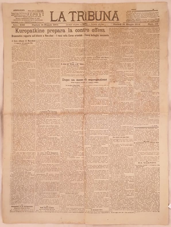 Numero del 31 maggio 1904 del quotidiano "La Tribuna" fondato a Roma nel 1883 dai politici Alfredo Baccarini e Giuseppe Zanardelli. Venne pubblicato fino al Novembre 1946.<BR>All'interno: Kuropatkine prepara la contro offesa, dopo un mese di segregazione in un campo russo,da Trento una questione doganale, Lo sciopero di Torre Annunziata, Pei fatti di Cerignola, Il re da Brescia a Cremona, Dimissioni dell'On. Bagnasco, Societa Eritrea per le miniere d'oro, L'archivio Orsini all'asta ecc.. In buone condizioni.<BR>Raro. Brossura editoriale in buone condizioni generali con lievi usure ai margini e dorso. Piegature. Legatura assente. All'interno le pagine si presentano in buone condizioni con rare fioriture. Parte mancante alla prima pagina con perdita di testo. In folio. Dim. 60,5x45 cm. Pp. 6. Number of the 31st of may 1904 of the daily magazine "La Tribuna" established in Rome in 1883 by the politicians Alfredo Baccarini and Giuseppe Zanardelli. It was published until the november 1946.<BR>Inside: Kuropatkine, after a month of segregation in a russian camp, from Trento an issue of borders, The strike of Torre Annunziata, Cerignola, The King from Brescia to Cremona, Dismissions of On. Bagnasco, Societa Eritrea for golden mines, OrsiniArchive at auction. In good conditions. Editorial cover in good general conditions slightly worn in the edges and spine. Foldings. Binding is missing. Inside pages are in good conditions with occasional foxings. Missing part in the first page with loss of text. In folio. Dim. 60,5x45 cm. Pp. 6.