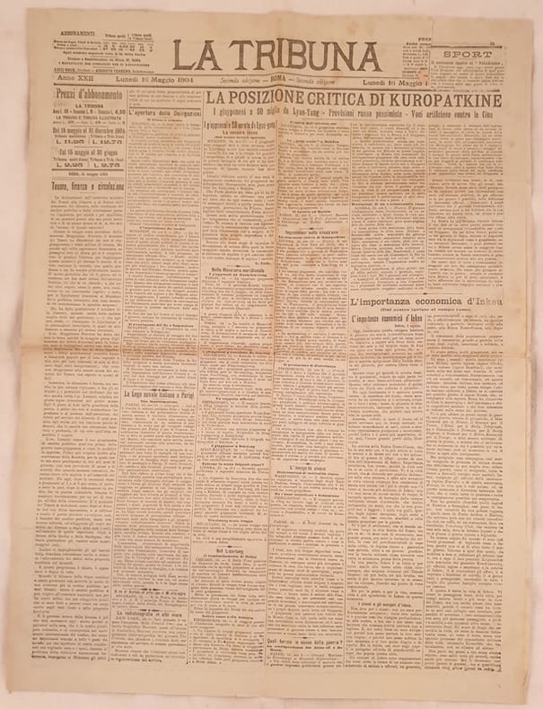 Numero del 16 maggio 1904 del quotidiano "La Tribuna" fondato a Roma nel 1883 dai politici Alfredo Baccarini e Giuseppe Zanardelli. Venne pubblicato fino al Novembre 1946.<BR>All'interno: La posizione critica di Kuropatkine, Nella Manciuria meridionale, L'importanza economica di Inkeu, La lega navale italiana a Parigi, il bombardamento di Dainy, il colloquio di Nisch, La gara musicale di Milano, 14 scheletri trovati presso Palermo, I romagnoli nell'Agro, Un comizio a Grottaferrata, il comizio anticlericale di Terni, scandalo Nasi, Tor di Quinto ecc..<BR>In buone condizioni. Raro. Brossura editoriale in buone condizioni generali con lievi usure ai margini e dorso. Piegature. Legatura assente. All'interno le pagine si presentano in buone condizioni con rare fioriture. Parte mancante alla prima pagina con perdita di testo. In folio. Dim. 60,5x45 cm. Pp. 6. Number of the 16th of may 1904 of the daily magazine "La Tribuna" established in Rome in 1883 by the politicians Alfredo Baccarini and Giuseppe Zanardelli. It was published until the november 1946.<BR>Inside: the position of Kuropatkine, In southern Manciuria, the economic importanceInkeu, italian naval league in Paris, the bombing of Dainy, the speech of Nisch, the musical award in Milan, 14 skeletons found near Palermo, romagnoli in Agro, Grottaferrata, Terni, scandalo Nasi, Tor di Quinto.<BR>In good conditions. Editorial cover in good general conditions slightly worn in the edges and spine. Foldings. Binding is missing. Inside pages are in good conditions with occasional foxings. Missing part in the first page with loss of text. In folio. Dim. 60,5x45 cm. Pp. 6.