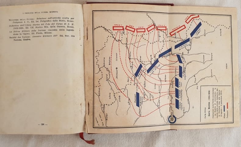 Edizione del 1939 di questo volume sulla seconda guerra mondiale scritto da Carlo de Rysky.<BR><BR>Il volume riguarda i problemi della guerra moderna e la politica militare dell'Italia.<BR><BR>All'interno: guerra 1914-18, mediterraneo e l'Italia, legge del 1925, propaganda durante la guerra, fanteria, Sindacati e le corporazioni, problema miliatre italiano terrestre navale aeronautico, guerra italo-etiopica, forze armate coloniali italiane, la Marina e le colonie ecc...<BR><BR>Note manoscritte.<BR><BR>Alla fine sono presenti cinque mappe ripiegate a colori.<BR><BR>In discrete condizioni. <BR><BR>Copertina in tela editoriale in buone condizioni generali con lievi usure ai margini e dorso. Legatura in mediocri condizioni. Corpo del libro parzialmente staccato. All'interno le pagine si presentano in buone condizioni con fioriture. In 16. Dim. 17x12 cm. Pp. 326+(6).