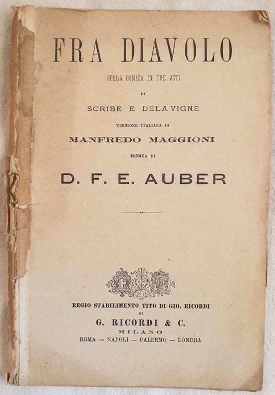 Edizione del 1912 del libretto d'opera Fra Diavolo di D. Auber.<BR>L'opera venne rappresentata per la prima volta il 28 gennaio 1830 all'Opera Comique di Parigi.<BR>In discrete condizioni. Copertina editoriale in discrete condizioni generali con lievi usure ai margini e dorso. Legatura in buone condizioni. All'interno le pagine si presentano in discrete condizioni con rare fioriture. In 8. Dim. 20x13,5 cm. Pp. 48.