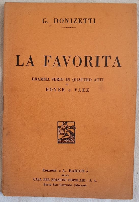 In 16. Dim. 18,5x12 cm. Pp. 32. Bel libretto d'opera del 1936 dell'opera "La favorita" di Gaetano Donizetti (1797-1848) su libretto di Royer e Vaez. La prima rappresentazione ebbe luogo al Teatro Opera di Parigi il 2 dicembre 1840. In discrete condizioni. Brossura editoriale in discrete condizioni generali con usure ai margini e dorso. Piattto anteriore in parte staccato. Legatura in buone condizioni. All'interno le pagine si presentano in buone condizioni con rare fioriture.Beautiful booklet of 1936 of the work in four acts "La favorita" by Gaetano Donizetti (1797-1848) on booklet by Royer and Vaez. The first representation took place in the Teatro Opera in Paris the 2nd of december 1840. In fair conditions Editorial cover in fair general conditions slightly worn in the edges and spine. Front plate almost detached. Stains. Binding in good conditions. Inside pages are in good conditions with occasional foxings.