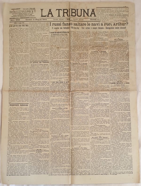 Numero del 12 maggio 1904 del quotidiano "La Tribuna" fondato a Roma nel 1883 dai politici Alfredo Baccarini e Giuseppe Zanardelli. Venne pubblicato fino al Novembre 1946.<BR>All'interno: I fatti di Fiume, I russi fanno saltare le navi a Port Arthur?, Inkeu, il trattato di lavoro tra la Francia e l'Italia, Continuano le illustrazioni alla fuga Nasi, Nasi non è nel Canton Ticino, La festa navale alla Spezia, I progetti ferroviari ecc.. In buone condizioni. Raro. Brossura editoriale in buone condizioni generali con lievi usure ai margini e dorso. Piegature. Legatura assente. All'interno le pagine si presentano in buone condizioni con rare fioriture. Parte mancante alla prima pagina con perdita di testo. In folio. Dim. 60,5x45 cm. Pp. 6.