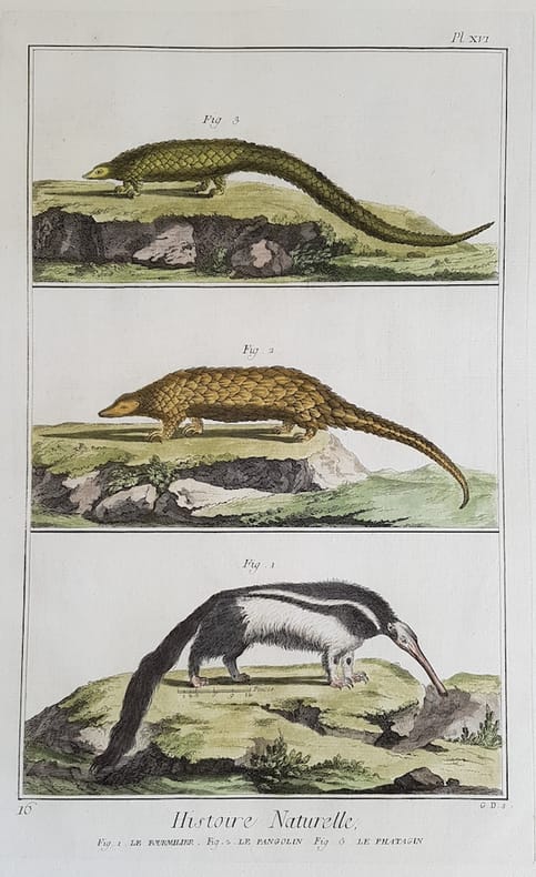 Deliziosa incisione colorata ad acquarello del 1770 circa che mostra un formichiere, un pangolino e un fatagino. Grandi dimensioni.<BR><BR>Autore: Antonio Baratti (1724-1787)<BR><BR>Atlante: Diderot et dAlembert Encyclopedie Livorno, 1770-1778<BR><BR>Data: 1770 circa<BR><BR>Tecnica: incisione a bulino acquarellata a mano<BR><BR>Dimensione della pagina: 40,5x27 cm <BR><BR>Dimensione dell'incisione: 31,5x20,5 cm<BR><BR> <BR><BR>Condizioni: ottime. Qualche fioritura Segno di tarlo al margine inferiore