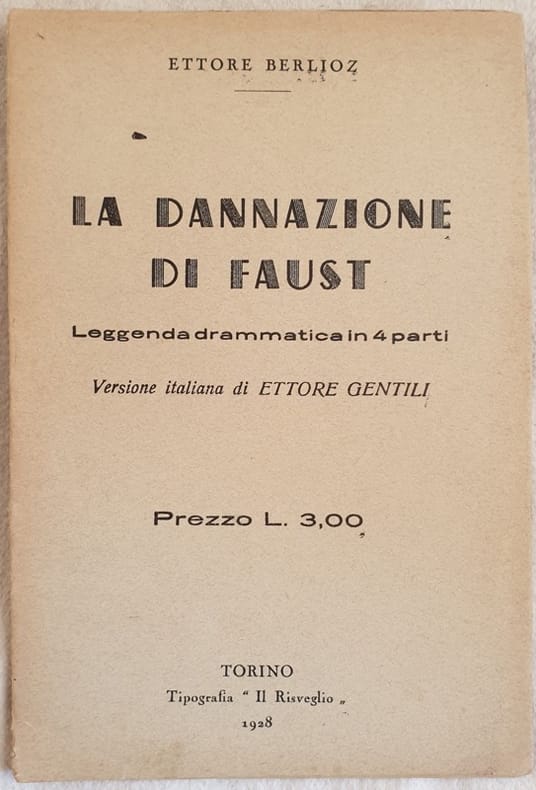 Libretto d'opera del 1928 dell'opera "La Dannazione di Faust" compositore francese Hector Berlioz (1803-1869). La prima rappresentazione ebbe luogo all'Opera Comique di Parigi nel 1846, in Italia nel 1895. In buone condizioni. Brossura editoriale in buone condizioni generali con lievi usure ai margini e dorso. Legatura in buone condizioni. All'interno le pagine si presentano in ottime condizioni con rare fioriture. In 16. Dim. 18,5x12,5 cm. Pp. 24.