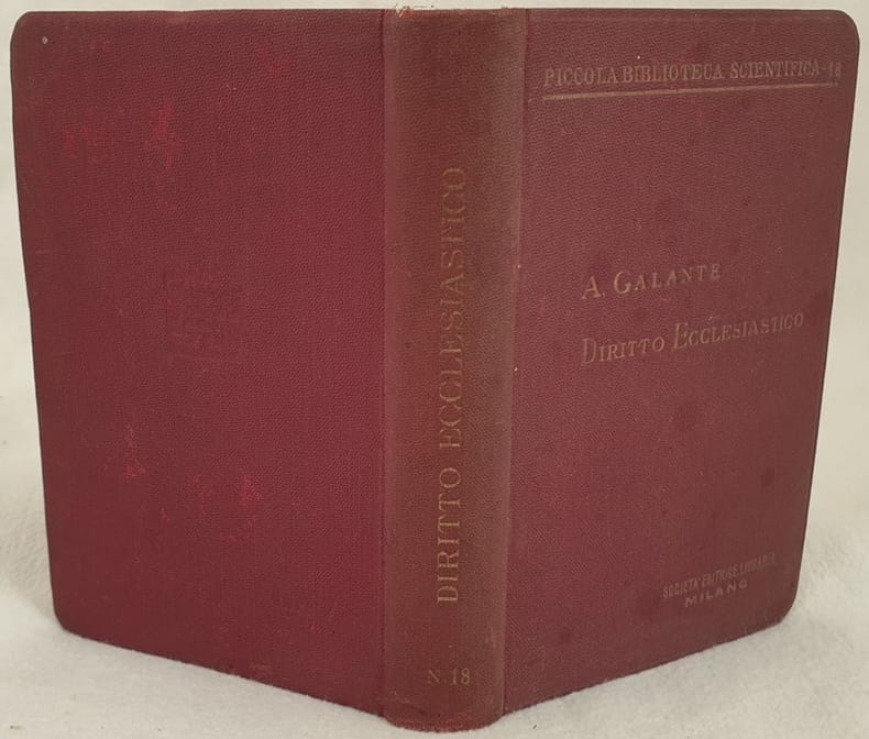Edizione del 1914 di questo manuale di diritto ecclesiastico del Prof. Andrea Galante. All'interno: la evoluzione storica della Chiesa e delle fonti del suo diritto, la chiesa cattolica, il diritto ecclesiastico dello stato italiano, stato e chiesa nei principali stati ecc...<BR>In ottime condizioni. Copertina in tela editoriale in ottime condizioni generali con lievi usure ai margini e dorso. Legatura in buone condizioni. All'interno le pagine si presentano in ottime condizioni con fioriture. In 24. Dim. 13,5x9 cm. Pp. XVI+691+(1).