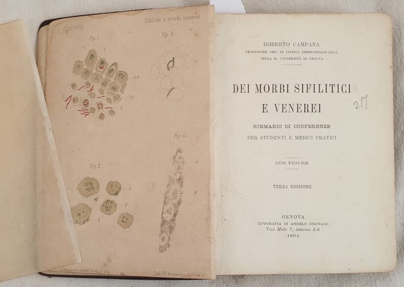 Edizione del 1894 di questo interessante studio sui morbi sifilitici e venerei scritto da Roberto Campana. All'interno 15 conferenze. Alcune illustrazioni tra le quali una planche a colori in antiporta. In discrete condizioni. Copertina editoriale in discrete condizioni generali con usure ai margini e dorso. Macchie. Legatura in buone condizioni ma la planche in antiporta staccata dalla legatura. All'interno le pagine si presentano in buone condizioni con rare fioriture. In 16. Dim.18x13 cm. Pp. XIV+(2)+416.
