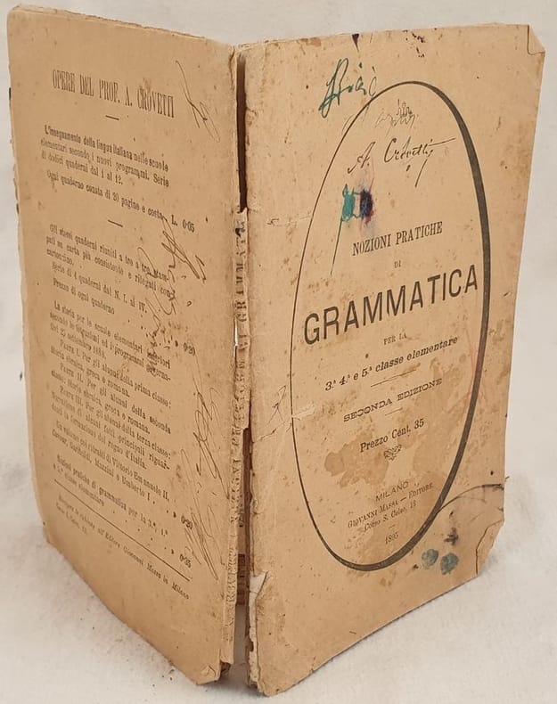 Edizione del 1895 di questa grammatica per la classe 3, 4 e 5 elementare scritta da Alfredo Crovetti. All'interno: nome, aggettivo, pronome, verbo, proposizione, componimenti, segno d'iunterpunzione. Note manoscritte. In discrete condizioni. Copertina editoriale in mediocri condizioni generali con usure ai margini e dorso. Legatura in discrete condizioni. All'interno le pagine si presentano in buone condizioni con rare fioriture. In 8. Dim.19x13 cm. Pp. 111+(1).