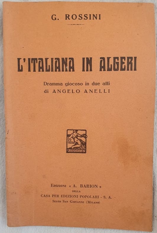 In 16. Dim. 18,5x12 cm. Pp. 32. Bel libretto d'opera del 1934 dell'opera "L'italiana in Algeri" di Gioachino Rossini (1792-1868) su libretto di Angelo Anelli.<BR>La prima rappresentazione ebbe luogo il 22 maggio 1813 al Teatro San Benedetto di Venezia.<BR>In buone condizioni. Brossura editoriale in buone condizioni generali con lievi usure ai margini e dorso. Macchie (vedere foto). Legatura in buone condizioni. All'interno le pagine si presentano in buone condizioni con fioriture.Beautiful booklet of 1934 of the work "L'Italiana in Algeri" by Wolfgang Amadeus Mozart (1756-1791) on booklet by Angelo Anelli The first representation took place the 22nd of may 1813 in the Theatre San Benedetto of Venice. In good conditions. Editorial cover in good general conditions slightly worn in the edges and spine. Stains. Binding in good conditions. Inside pages are in good conditions with foxings.