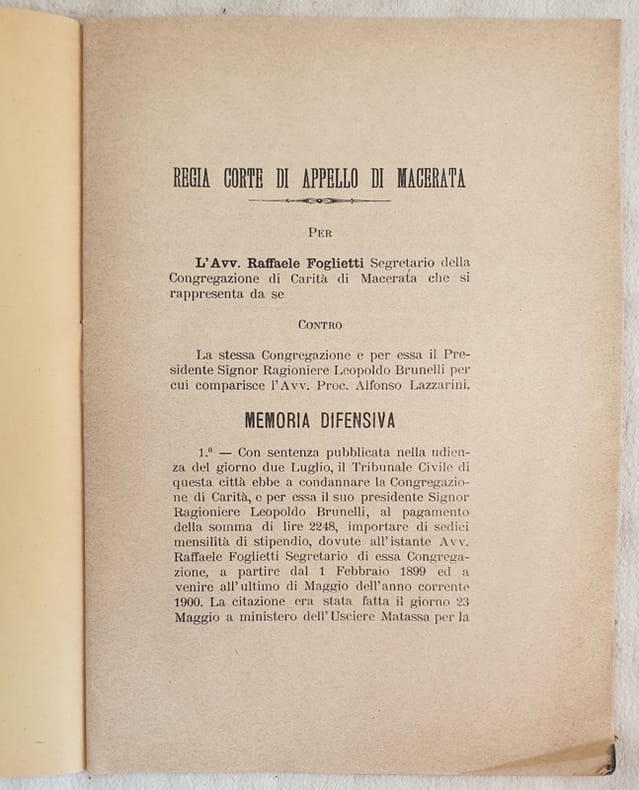 Interessante pubblicazione memoria difensiva dell'Avv. Raffaele Foglieti della Regia Corte di Appello di Macerata del 1900. La memoria riguarda la sentenza di condanna della Congregazione di Carità e il suo presidente Leopoldo Brunelli. In buone condizioni. Copertina morbida coeva in ottime condizioni generali con lievi usure ai margini e dorso. Legatura in ottime condizioni. All'interno le pagine si presentano in buone condizioni con rare fioriture. Macchie di inchiostro marginali. In 8. Dim. 26x18,5 cm. Pp. 18. Interesting pamphlet defensive memory of Avv. Raffaele Foglieti della Regia Corte di Appello of Macerata of 1900. The memory rrelates the sentence of condamnation of Congregazione di Carità and its president Leopoldo Brunelli. In good conditions Soft coeval cover in very good general conditions slightly worn in the edges and spine. Binding in very good conditions. Inside pages are in good conditions with occasional foxings. Ink's stains in the edges. In 8. Dim. 26x18,5 cm. Pp. 18.