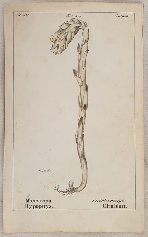 Bella cromolitografia del 1843 che rappresenta l'ipopitide tratta dalla celebre opera di botanica "Flora der Schweiz" di Heinrich Romer sulla flora della Svizzera. In buone condizioni, qualche fioritura. Segni di colla al verso. TECNICA: Cromolitografia DIMENSIONI FOGLIO: cm 17,5x11 DIMENSIONI INCISIONE: cm 15,5x9,5 EPOCA: 1843 CONDIZIONI: Buone condizioni, qualche fioritura. Piccoli strappi al margine inferiore. Resto di colla al verso. Beautiful chromolythography of 1843 representing pinesap taken form the famous work of botany "Flora der Schweiz" by Heinrich Romer about flowers of Switzerland.<BR>In good conditions, some foxings. Glue signs in the verso of page. TECHNIQUE: Lytography PAGE SIZE: cm 17,5x11 PRINT'S SIZE: cm 15,5x9,5 PERIOD: 1843 CONDITION: good conditions with some foxings. Little tears in the lower edge. Glue signs in the verso of page.