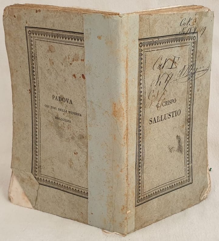 In 16. Dim. 16,5x9 cm. Pp. 163. Rara edizione del 1826 di due importanti opere dello storico romano Caio Crispo Sallustio tradotte dal drammaturgo, poeta e scrittore Vittorio Amedeo Alfieri (1749-1803). Il volume contiene l'elegante traduzione delle opere "La guerra di catilina" e la "Guerra di Giugurta" nella quale Sallustio descrive la guerra combattuta dai romani (111-105 a.c.) contro Giugurta re di Numidia. Antica firma al frontespizio. In buone condizioni. Copertina editoriale coeva in discrete condizioni generali con lievi usure ai margini e dorso. Segni di tarlo e rotture al dorso. Legatura in discrete condizioni con qualche lieve rottura. Pagine si presentano in buone condizioni con fioriture e qualche gora d'umidità marginale.Scarce edition of 1826 of two important works by the roman historian Caio Crispo Sallustio translated by the dramawriter, poet and writer Vittorio Amedeo Alfieri (1749-1803). The volume contains the elegant translation of "La guerra di catilina" and the "Guerra di Giugurta" in which Sallustio describes the war fought by romans (111-105 a.c.) against Giugurta king of Numidia. Ancient signature in the title page. In good conditions. Editorial coeval cover in fair general conditions slightly worn in the edges and spine. Worming and cracks in the spine. Binding in fair conditions with some slight cracks. Inside pages are in good conditions with foxings and some humidity stain in the edges.
