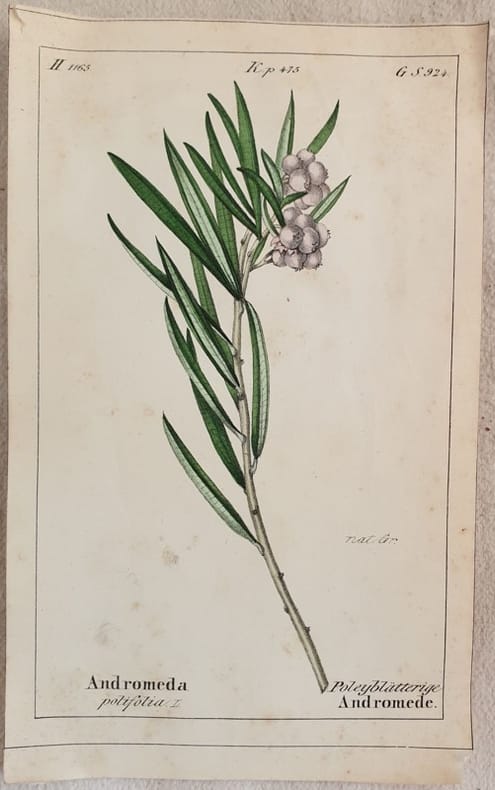 Bella cromolitografia del 1843 che rappresenta il rosmarino di palude tratta dalla celebre opera di botanica "Flora der Schweiz" di Heinrich Romer sulla flora della Svizzera. In buone condizioni, qualche fioritura. Segni di colla al verso. TECNICA: Cromolitografia DIMENSIONI FOGLIO: cm 17,5x11 DIMENSIONI INCISIONE: cm 15,5x9,5 EPOCA: 1843 CONDIZIONI: Buone condizioni, qualche fioritura. Piccoli strappi al margine inferiore. Resto di colla al verso. Beautiful chromolythography of 1843 representing bog rosemary taken form the famous work of botany "Flora der Schweiz" by Heinrich Romer about flowers of Switzerland.<BR>In good conditions, some foxings. Glue signs in the verso of page. TECHNIQUE: Lytography PAGE SIZE: cm 17,5x11 PRINT'S SIZE: cm 15,5x9,5 PERIOD: 1843 CONDITION: good conditions with some foxings. Little tears in the lower edge. Glue signs in the verso of page.