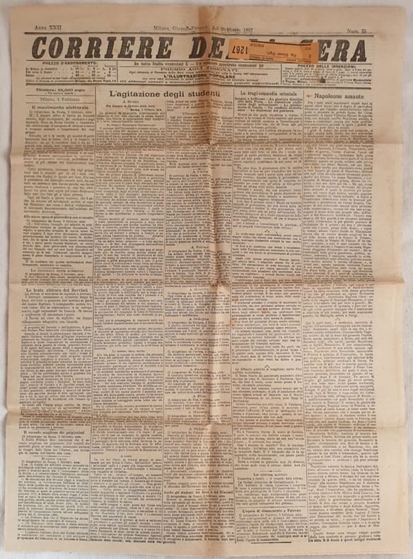 Numero del 25 26 febbraio 1897 di questo storico quotidiano italiano fondato a Milano nel 1876. Tra gli articoli presenti: Le trattative delle Potenze per l'autonomia di Candia, Incendio alla Canea, La querela del Ministro Guicciardini, Il carnevale a Roma; La fotografia a colori col metodo Selle Ives, L'edizione italiana degli scritti d'arte di Giovanni Moretti, Per la diffusione della lingua e della cultura italiana ecc.. Belle pubblicità. Etichette. In buone condizioni.Raro. Brossura editoriale in buone condizioni generali con lievi usure ai margini e dorso. Piegature. All'interno le pagine si presentano in buone condizioni con rare fioriture. Piegature ed usure marginali. Piccolo foro con qualche lettera mancante. In folio. Dim. 59,5x44 cm. Pp. 4. Number of the 24th 25th of february 1897 of this historical daily magazine established in Milan in 1876. Between the issues treated: the agreement of powerships for the autonomy of Candia, Fire in Canea, the claim of Ministery Guicciardini, Carnival in Rome; Colour photography with method Selle Ives, Italian edition of art writings of Giovanni Moretti, For spread of italian language and culture etc.. In good conditions. Scarce copy. Editorial cover in good general conditions slightly worn in the edges and spine. Foldings and wearings. Inside pages are in good conditions with foxings. Foldings. In folio. Dim. 59,5x44 cm. Pp. 4.