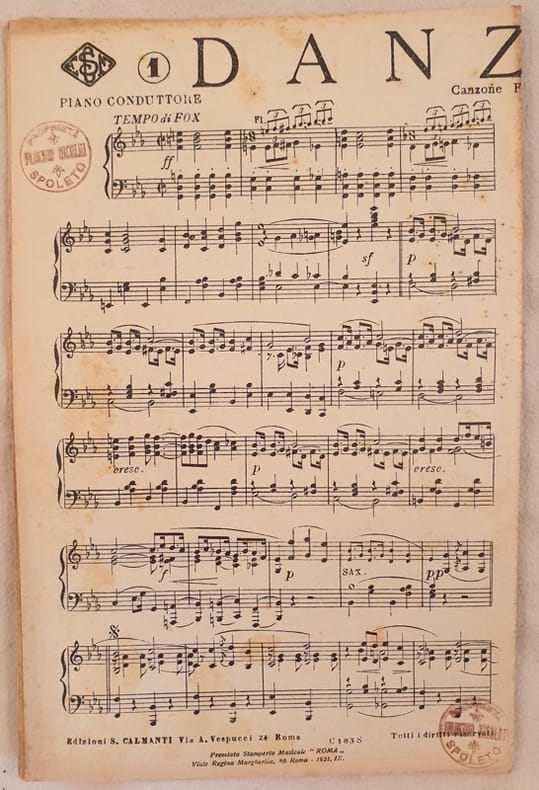 Bello spartito, partitura completa per orchestra del 1931 di due canzoni.<BR>Copertina mancante. GENERE: STRUMENTI: pianoforte, violino, violoncello, contrabasso, clarinetto, flauto, sassofono, trombone, batteria, tromba ANNO: 1931 DIMENSIONI: In 8. cm 26,5x17,5 PAGINE: 28 CONDIZIONI: In buone condizioni NOTE: Ex libris alla prima pagina Beautiful score of two songs, a complete score for orchestra of 1931. <BR>Cover is missing. MUSIC: STRUMENTI: piano; violin; violoncello; contrabbass; flute; clarinet; trombone; saxophone; drums, trumpet<BR>YEAR: 1931 SIZE: In 8. cm 26,5x17,5 PAGES: pp. 28 CONDITIONS: In good conditions NOTES: ex libris in the first page