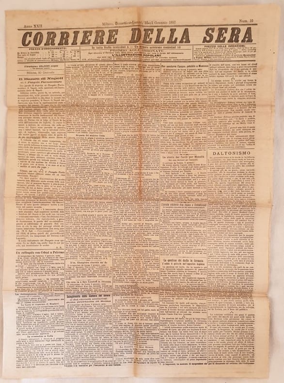 Numero del 10 11 gennaio 1897 di questo storico quotidiano italiano fondato a Milano nel 1876. Tra gli articoli presenti: Il Banco di Napoli ed il Pungolo Parlamentare, Un colloquio con Crispi a Palermo, DaltonismoPer condurre l'acqua potabile a MAssaua, Il Barone Banffy omicida, La commemorazione di Vittorio Emanuele, A proposito del crollo a Napoli, Per i danneggiati di Sant'Anna ecc.. Belle pubblicità. Etichette. In buone condizioni.Raro. Brossura editoriale in buone condizioni generali con lievi usure ai margini e dorso. Piegature. All'interno le pagine si presentano in buone condizioni con rare fioriture. Piegature ed usure marginali. In folio. Dim. 59,5x44 cm. Pp. 4.Number of the 10th, 11st of january 1897 of this historical daily magazine established in Milan in 1876. Between the issues treated: The Banco di Napoli and Pungolo Parlamentare, A speech with Crispi in Palermo, Daltonism, To lead fresh water in MAssaua, The Barone Banffy murderer, The commemoration of Vittorio Emanuele, About collapse in Naples, For ruined people in Sant'Anna etc.. In good conditions. Scarce copy. Editorial cover in good general conditions slightly worn in the edges and spine. Foldings and wearings. Inside pages are in good conditions with foxings. Foldings. In folio. Dim. 59,5x44 cm. Pp. 4.
