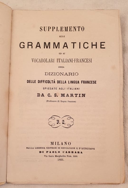 Rara pubblicazione del 1866 di questo piccolo dizionario delle difficolta della lingua francese spiegate agli italiani scritto da Martin. Supplemento alle grammatiche ed ai vocabolari italiani francesi. In ottime condizioni. Copertina editoriale in ottime condizioni generali con lievi usure ai margini e dorso. Legatura in buone condizioni. All'interno le pagine si presentano in ottime condizioni con rare fioriture. Segni di tarlo da pag. 75 alla fine. In 8. Dim. 19x12,5 cm. Pp. 79+(1).Scrace pamphlet of 1866 of this brief dictionary of difficulties of french langauges explained to italian people written by Martin. Supplement to italian french gramamrs and vocabularies. In very good conditions. Editorial cover in very good general conditions slightly worn in the edges and spine. Binding in good conditions. Pages in very good conditions with occasional foxings. Worming from page 75 until the end. In 8. Dim. 19x12,5 cm. Pp. 79+(1).<BR><BR>