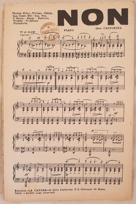 Bello spartito, partitura completa per orchestra del 1933 di due canzoni. Copertina mancante. GENERE: Slow STRUMENTI: pianoforte, violino, violoncello, sassofono; contrabasso, banjo; trombone, batteria, tromba ANNO: 1933 DIMENSIONI: In 8. cm 27x17,5 PAGINE: 26 CONDIZIONI: In discrete condizioni. Usura marginale. NOTE: Ex libris alla prima pagina Beautiful score of two songs, a complete score for orchestra of 1933. <BR>Cover is missing. MUSIC: One step STRUMENTI: piano; violin; violoncello; contrabbass; saxophone; banjo; trombone; drums, trumpet YEAR: 1933 SIZE: In 8. cm 27x17,5 PAGES: pp. 26 CONDITIONS: In good conditions NOTES: ex libris in the first page