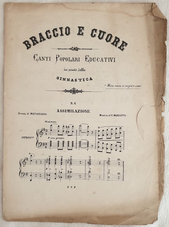 Spartito per pianoforte del 1871 della pubblicazione "Braccio e cuore" canti popolari educativi in aiuto della ginnastica composti da Corinno Mariotti (1827-1876) nato a Parma. Siamo in possesso del solo pezzo n. 6 "Assimilazione". Parole di Metastasio. In 8. cm 28x20. pp. (4). Discrete condizioni. Alcuni strappi marginali e gore. Musical score for piano of 1871 from the pamphlet "Braccio e cuore" popular chants for gymnastics composed by Corinno Mariotti (1827-1876) born in Parma. We only have the piece n. 6 "Assimilazione". Words by Metastasio. In 8. cm 28x20. pp. (4). Fair conditions. Some tears in the edges and water stains.