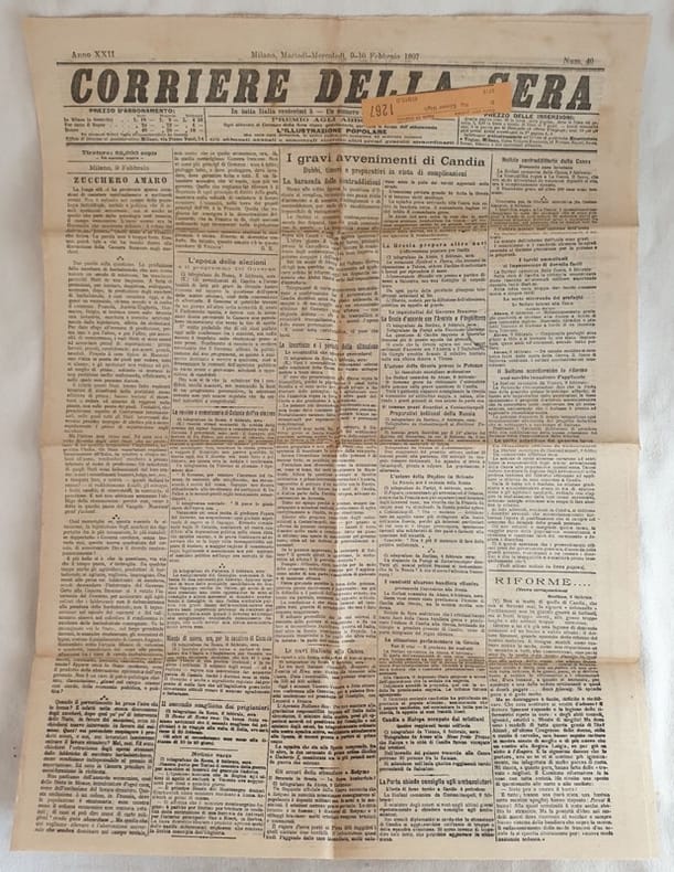Numero del 8-9 febbraio 1897 di questo storico quotidiano italiano fondato a Milano nel 1876. Tra gli articoli presenti: La rivoluzione di Candia, La nomina a commissario di Catania dell'ex sindaco, Le navi italiane alla Canea, Il generale Baratieri, Giacinto Gallina ecc.. Belle pubblicità. Etichette. In buone condizioni.Raro. Brossura editoriale in buone condizioni generali con lievi usure ai margini e dorso. Piegature. All'interno le pagine si presentano in buone condizioni con rare fioriture. Piegature ed usure marginali. In folio. Dim. 59,5x44 cm. Pp. 4.Number of the 9th 10th of february 1897 of this historical daily magazine established in Milan in 1876. The articles inside: Revolution of Candia, the nomination of Commissario of Catania of the former major, Italian ships in Canea, The general Baratieri, Giacinto Gallina Beautiful advertisings inside. Labels. In good conditions.Scarce copy. Editorial cover in good general conditions slightly worn in the edges and spine. Foldings and wearings. Inside pages are in good conditions with occasional foxings. Foldings. In folio. Dim. 59,5x44 cm. Pp. 4.