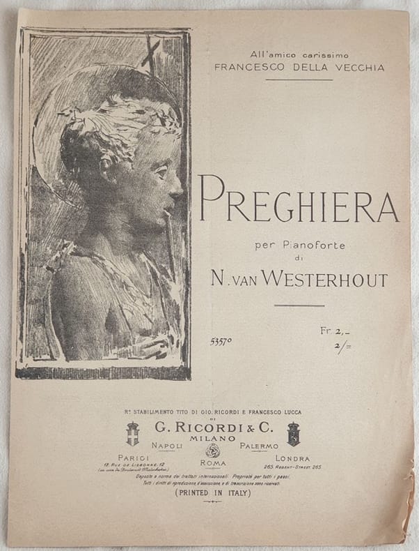 Edizione Ricordi di questo spartito per pianoforte "Preghiera n. 53570" senza data ma della fine ottocento inizi novecento del compositore Niccolo Van Westerhout (1857-1989) nato a Mola di Bari. Copertina illustrata. Ottime condizioni, qualche fioritura e piccolo strappo. In folio. cm 32,5x24. pp. (1)+3. Ricordi edition of this musical score for piano "Preghiera n. 53570" by the composer Niccolo Van Westerhout (1857-1989) born in Mola di Bari.. Not dated but of the end of 19th early 20th century. Illustrated cover. Very good conditions, some foxings and little tear. In folio. cm 32,5x24. pp. (1)+3.