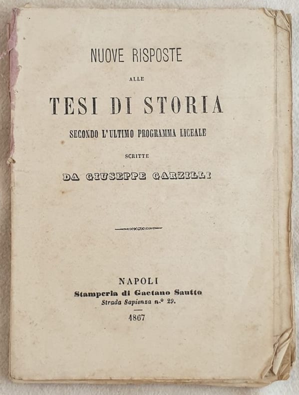 Raccolta di due pubblicazioni ad uso del liceo. La prima del 1867 riguarda la storia secondo l'ultimo programma di liceo ed è scritta da Giuseppe Garzilli. La seconda del 1870 circa di aritmetica per gli esami ginnasiali. Risultano mancanti la pag. 3 e 5, dalla 19 alla 22 e dalla 27. In buone condizioni. Copertina assente. Legatura quasi assente. All'interno le pagine si presentano in ottime condizioni con rare fioriture, ancora da rifilare. In 8. Dim. 19,5x13 cm. Pp. 92, 26. Collection of two pamphlets for the usage of classical high school. The first one of 1867 relates the history according to the last programme of clasical high school and it has been written by Giuseppe Garzilli. The second one of 1870 circa of arythmetics for Gimnasio examinations. Pag. 3 and 5, from 19 to 22 and from 27 are missing. In good conditions. Copertina assente. Legatura quasi assente. All'interno le pagine si presentano in ottime condizioni con rare fioriture. In 8. Dim. 19,5x13 cm. Pp. 92, 26. Cover is missing. Binding is almost missing. Inside pages are in very good conditions with occasional foxings, still uncut. In 8. Dim. 19,5x13 cm. Pp. 92, 26.